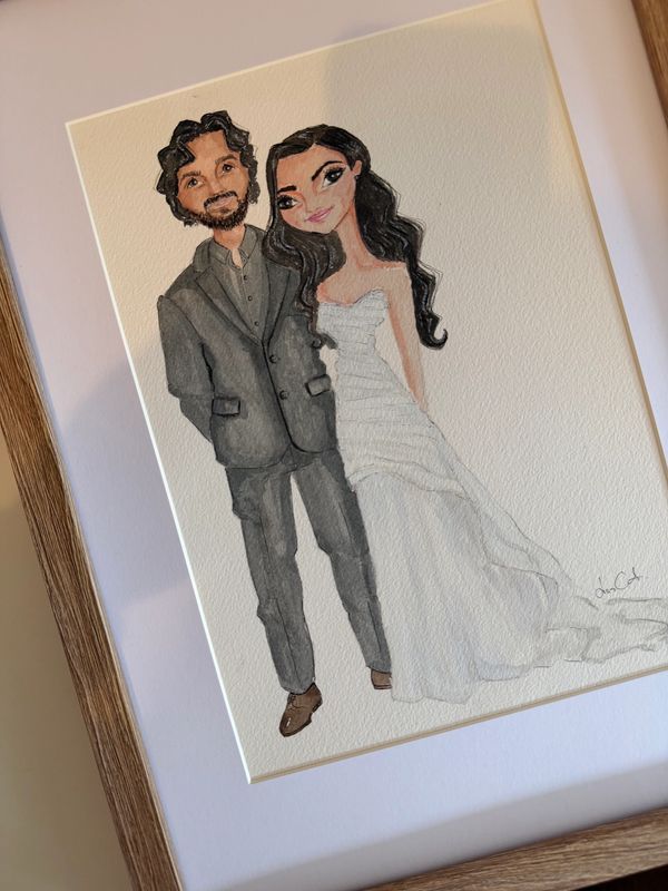With any live illustration package, you will receive a beautifully A4 Watercolour painted illustration of the bride and groom. This piece will be displayed at my table for all your guests to admire, and it will be presented to you as a special keepsake after the event.